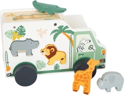 Safari auto poskytuje prostor pro rozvoj fantazie a jemné motoriky výběrem a umisťováním dřevěných zvířátek.