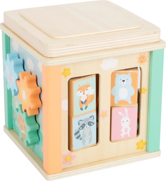 Objevte univerzální dřevěnou motorickou kostku, která rozvíjí jemnou motoriku, logické myšlení a rozpoznávání tvarů i barev. Nabízí hned několik aktivit: perličkové bludiště, vkládání tvarů, otáčecí obrázky a ozubená kolečka. Díky kompaktnímu provedení a možnosti otočit a vložit víko dovnitř šetří místo v dětském pokojíčku.