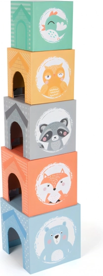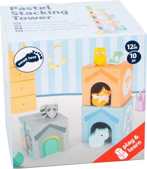 Objevte hravou a vzdělávací zábavu se skládací věží v jemných pastelových barvách od small foot. Děti mohou kostky stavět, vnořovat do sebe a schovávat dřevěná zvířátka do okýnek a „domečků“. Tato kreativní hra rozvíjí jemnou motoriku, koordinační schopnosti, logické myšlení i poznávání barev a tvarů, a zároveň láká krásnými ilustracemi zvířátek a vysokým podílem dřeva.