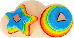 Nasazovací věž Duha Duo je dřevěná hračka navržená k podpoře učení a rozvoje dětí. Nabízí možnost seřadit dílky podle velikosti a tvaru - hvězdiček a koleček - v zářivě barevném provedení. Tato hračka stimuluje rozpoznávání barev a koordinační schopnosti, zatímco děti zábavně staví duhu.