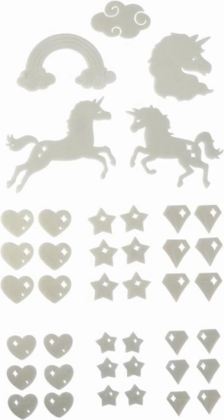 Rozzáří dětský pokoj sadu svítících dekorací do tmy s motivem jednorožce a dalších obrázků. Po krátkém nasvícení září ve tmě a snadno se připevní na stěnu, strop i nábytek. Balení obsahuje 41 ks a lepicí gumu pro jednoduchou instalaci.