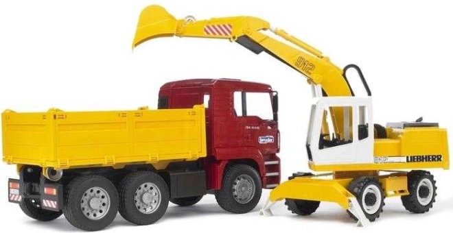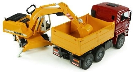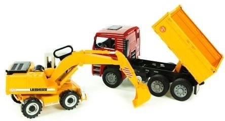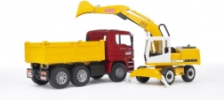 Tato úžasná stavební sada od firmy Bruder zahrnuje nákladní vůz MAN TGA s měkkými pneumatikami a praktickou sklopnou korbou. Spolu s ním naleznete funkční bagr Liebherr, který se pyšní stabilizačními opěrnými nohami, profilovanými pneumatikami a rýpadlem s otočnou kabinou o 360°. Výrobek je kvalitně zpracován v Německu z odolných materiálů.