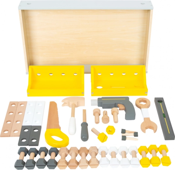 - Dřevěné nástroje: Osmi kusová sada zahrnuje kladivo, pilku, šroubovák a další, což dětem poskytuje plný zážitek z opravdového dílenského prostředí.