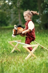 Plyšový koník na tyči Nico je ideální společník pro malé jezdce. Jemná plyšová hlava s uzdou a otěžemi láká k fantazijním hrám, zatímco dřevěná tyč se stabilními madly a kolečky zajišťuje pohodlný a plynulý pohyb po podlaze i venku. Děti si užijí autentičtější zážitek díky zvukovému efektu – po stisknutí uší koník radostně řehtá.