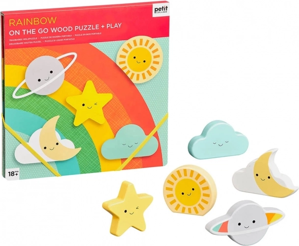 Odolné dřevěné puzzle pro nejmenší od 18 měsíců. 5 dřevěných dílků, 2 hrací scény a veselý motiv duhy podporují jemnou motoriku, soustředění i radost z objevování. Vyrobeno z dřeva a recyklovaného papíru.