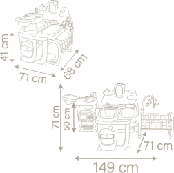 V kuchyňském koutku najdete dřez s kohoutkem, hrnce, talíř a lahvičku na krmení. Koupelna je vybavena vyjímatelnou vaničkou, sprchou, přebalovacím pultem a důmyslnými uchyty pro lahvičky a obrázky. Ložnice obsahuje kolébku s kolotočem a lampičku se svítícím stínidlem.
