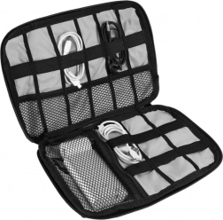 Tento šedý cestovní organizér je skvělým řešením pro každého, kdo chce mít elektronické příslušenství vždy po ruce a v dokonalém pořádku. Je vyroben z odolného polyesteru, nabízí promyšlené oddíly, pružné pásky a síťované kapsy pro bezpečné uložení kabelů, nabíječek, powerbank, USB flash disků či paměťových karet. Uzavírání na kvalitní zip chrání obsah při přenášení.