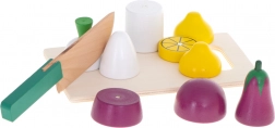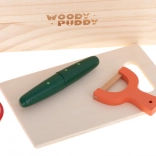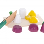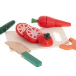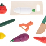 Součástí je prkénko, bezpečný nůž i loupátko. Malí kuchaři si vyzkouší přípravu jídla krok za krokem – od loupání po krájení.