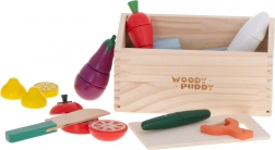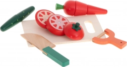 - mrkev, petržel (ředkvička), okurka, rajče (včetně plátků), citron, lilek, prkénko, bezpečný nůž, bezpečné loupátko, dřevěná bedýnka