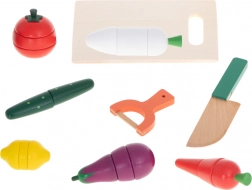 Tato dřevěná magnetická sada do dětské kuchyňky přináší realistické krájení a loupání bez nebezpečí. Zeleninu rozdělíte bezpečným nožem, položíte na prkénko a po hře ji díky magnetům snadno spojíte zpět. Děti si tak hravou formou fixují zdravé návyky a pochopí i princip magnetického spojování.