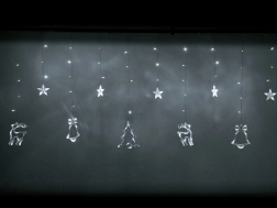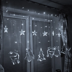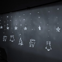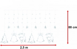 Vytvořte si doma kouzelnou sváteční atmosféru se světelnou kurtynou s motivy soba, stromku, hvězdy a zvonku. 138 LED v odstínu studeně bílá jemně rozzáří interiér, nabízí 8 světelných režimů a díky síťovému napájení svítí bez starostí s bateriemi. Robustní kabel zaručuje dlouhou životnost a praktické propojovací konektory umožní spojit více sad dohromady.