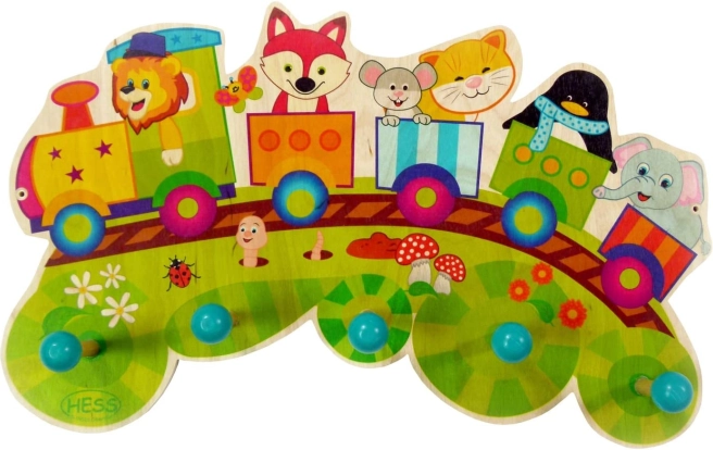 Poutavý barevný věšák do dětského pokoje či chodby s motivem vláčku a pěti háčky pro zavěšení oděvu. Vyroben z ekologicky šetrného dřeva, použity ekologické barvy.