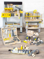 Součástí balení je bohaté příslušenství: konstrukční lišty a desky s předvrtanými otvory, kostky, kola, adaptéry kol, distanční pouzdra a dva dřevěné nástroje – klíč a šroubovák. Vše přehledně uložíte do praktického boxu, takže se žádný dílek neztratí.