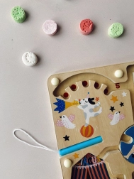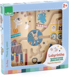 Magnetický labyrint VILAC přináší dětem od 2 let svět cirkusu v jemných barvách Michelle Carlslund. Kouzelným perem s magnetem posouvají kuličky dráhami, setkají se s akrobaty, zvířaty i klauny a na konci vrátí každou kuličku na správné místo podle barvy a čísla. Hra přirozeně rozvíjí soustředění a trpělivost.