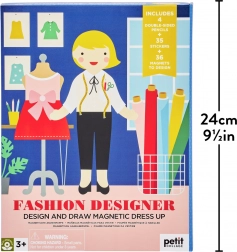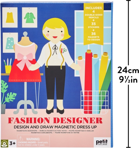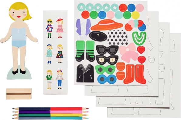Hračka obsahuje magnetickou figurku s dřevěným stojanem, 36 magnetických dílků oblečení, 4 oboustranné pastelky a 35 nálepek, což umožňuje vytvoření více než 100 různých outfitů. Děti mohou vyjádřit svou kreativitu a rozvíjet svou představivost díky různorodosti dílků a možnostem kombinování. Krabička slouží nejen jako úložný prostor, ale také jako příjemné pozadí pro hru, díky čemuž je celý zážitek komplexní a estetický.