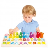Multifunkční dřevěná hra pro kreativní učení a zábavu. Ideální pro rozpoznávání čísel, tvarů, barev a rozvoj jemné motoriky.