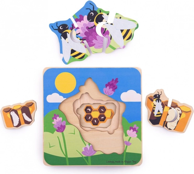 Vrstvená konstrukce s postupně se měnícími obrázky ukazuje jednotlivé fáze vývoje – od vajíčka až po dospělou včelu. Díly jsou velikostně přizpůsobené dětským rukám a díky pevnému provedení vydrží i časté používání.
