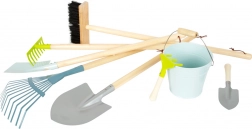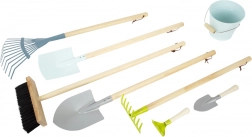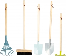 Dřevěné násady a kovové pracovní části zvládnou každodenní dětské používání na zahradě, pískovišti i dvorku.