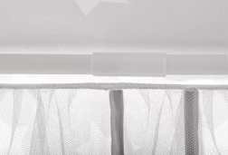 Šest vstupů se světlými, poloprůhlednými záclonkami lze stáhnout a uvázat na mašle. Děti mají dostatek světla, vzduchu i pocitu bezpečí.