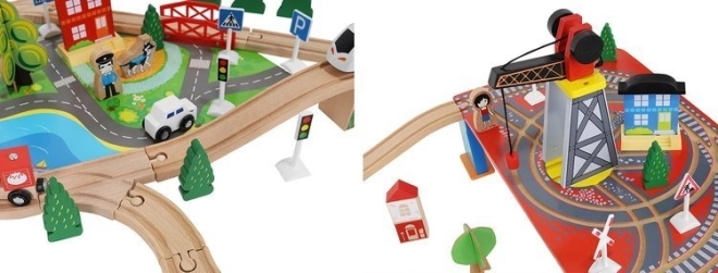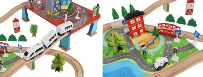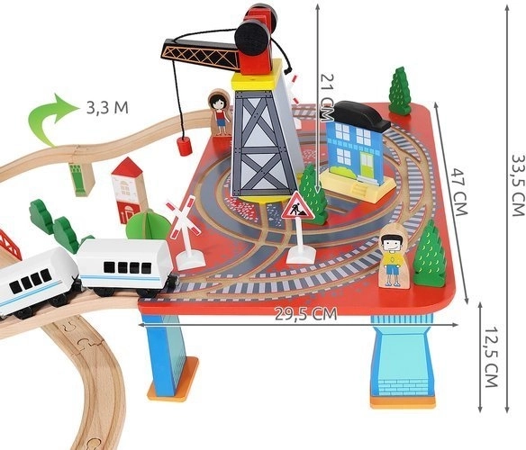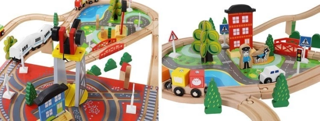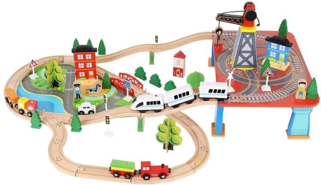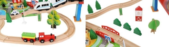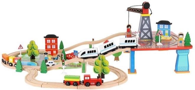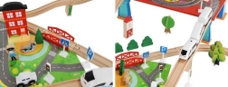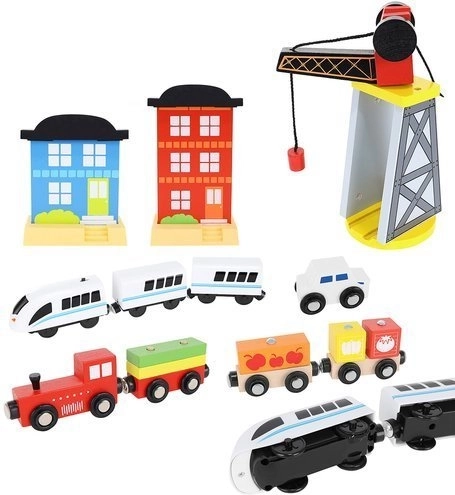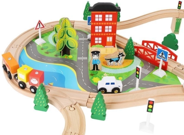 Dřevěná vláčkodráha s celkem 88 precizně vyrobenými prvky, včetně železnice, nákladního a osobního vlaku, automobilu, stromků a dopravních značek. Zábava spočívá v možnosti vytvořit si vlastní trasu, zatímco magnetické spojení jednotlivých částí zajišťuje snadnou obsluhu.