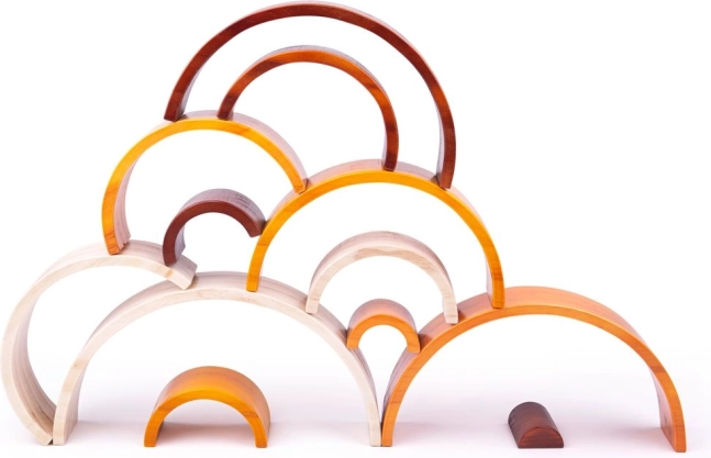 Tato velká dřevěná duha je vyrobena z masivního dřeva a obarvena netoxickými barvami. Můžete ji využít nejen jako hračku, ale i jako stylový dekorativní prvek v dětském pokoji či školce. Duha nevyžaduje pravidla a pokyny, díky čemuž dětem rozvíjí jejich kreativní myšlení.