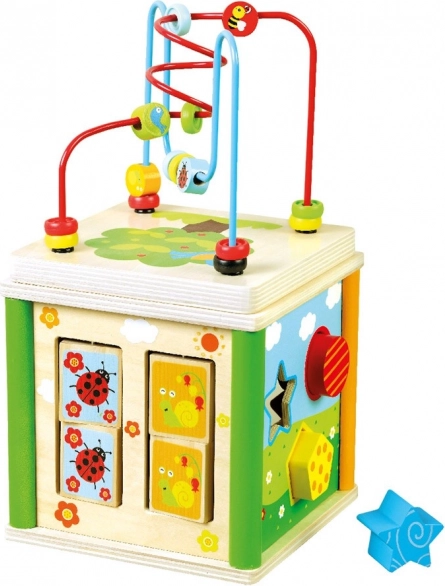 Díky různým aktivitám si děti hravou formou procvičí logické uvažování, soustředění a tvořivost. Kostka je vyrobena z odolného dřeva a doplněna prvky z kovu, takže vydrží i každodenní dětské objevování.