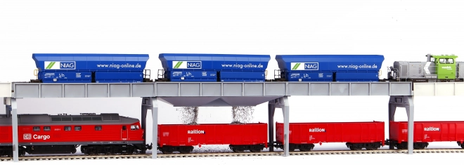 Realistický model betonového rámového mostu s integrovanou funkcí vykládky sypkých nákladů pro měřítko H0. Sestává ze tří segmentů s loži pro koleje a kulisami pro automatické otevření klapek vagonů. Ideální doplněk pro detailní kolejiště a plynulý provoz nákladních souprav. Funkční vykládka, automatické ovládání klapek a pevná rámová konstrukce pro autentický provoz.