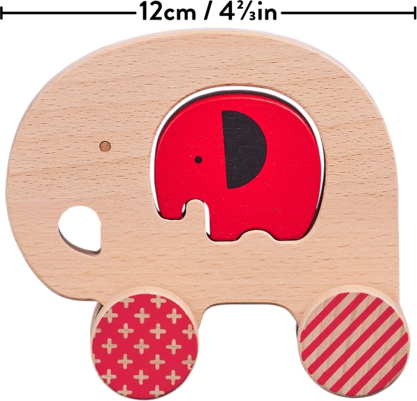 Vyjímatelné červené slůně se vkládá do otvoru uprostřed slona. Děti si procvičí úchop, logiku i koordinaci při tahání na kolečkách.