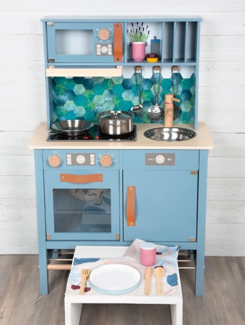 Dětská jídelní sada Tasty od Small Foot přináší do vašeho domova moderní design kombinující přírodní dřevo s barvami kouřové modré a bobulově červené. Tato sada obsahuje talíře, šálky, příbory a prostírání pro dvě osoby, ideální pro malé kuchaře, kteří se chtějí naučit správné stolování.