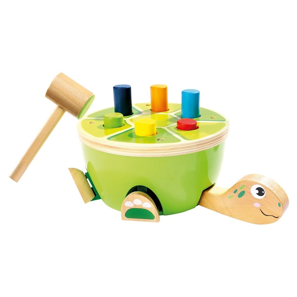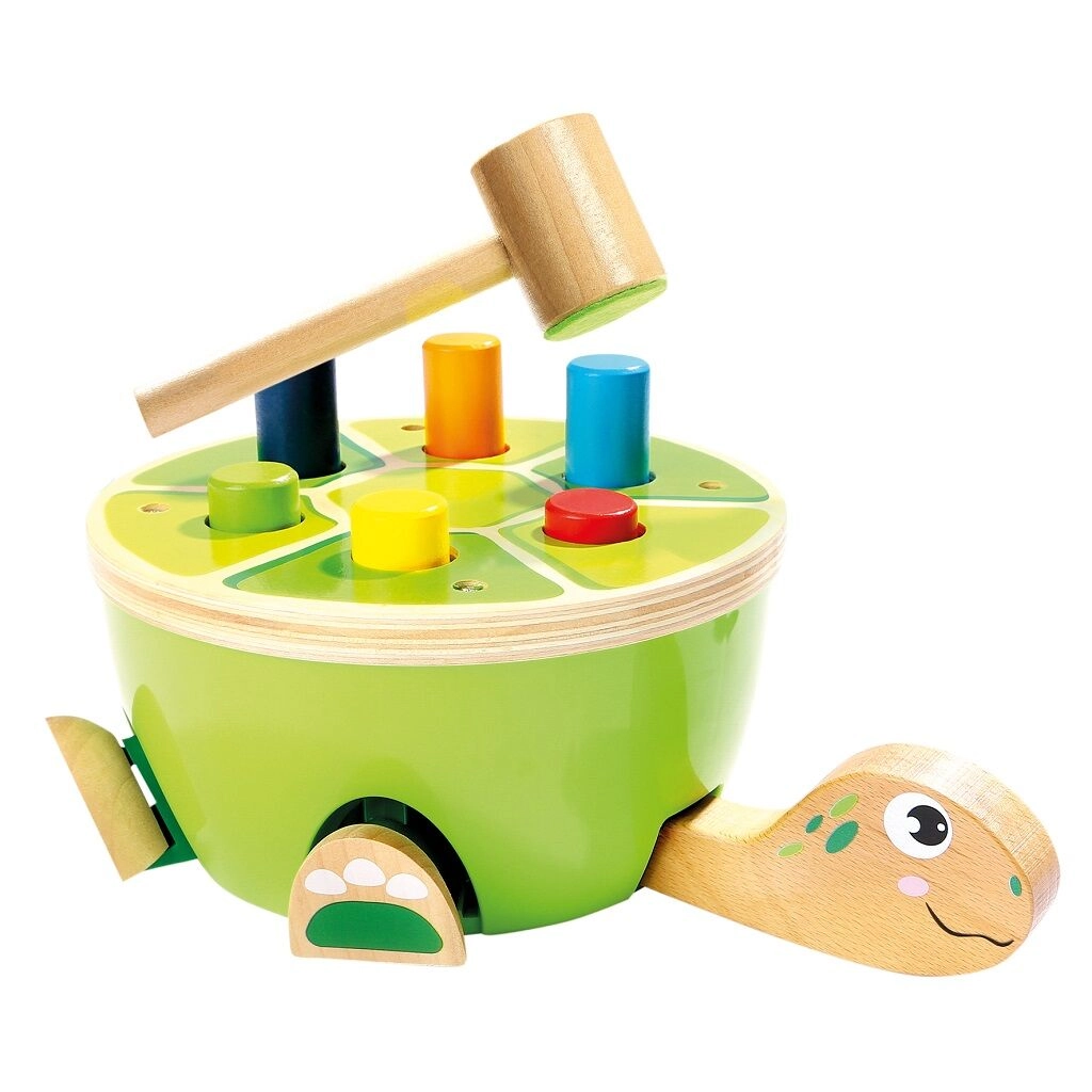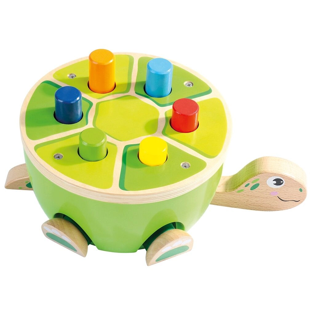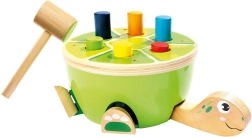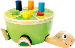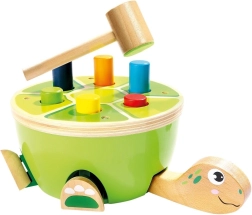 Tato želví zatloukačka od Bino je ideální volbou pro první motorické hry. Děti pomocí dřevěného kladívka s měkkým plstěným potahem bezpečně zatloukají barevné kolíčky do krunýře. Při hře se přirozeně rozvíjí jemná motorika, koordinace ruka–oko i soustředění, a díky veselému provedení hračka udrží pozornost na dlouhou dobu.