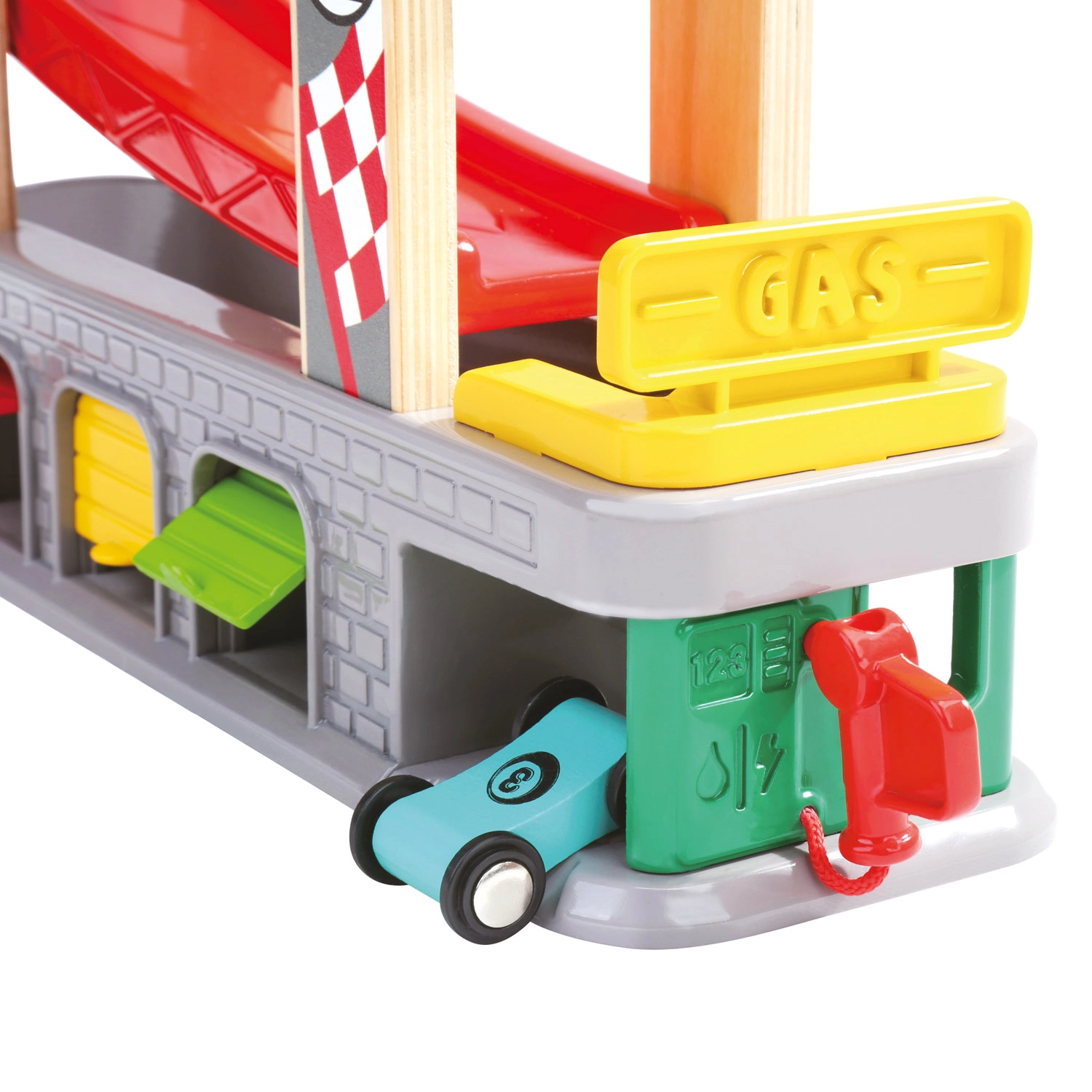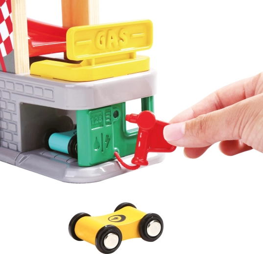 Tři garáže s otevíratelnými dvířky a tankovací stanice podporují nápadité scénáře – od servisní zastávky po parkování a třídění aut.