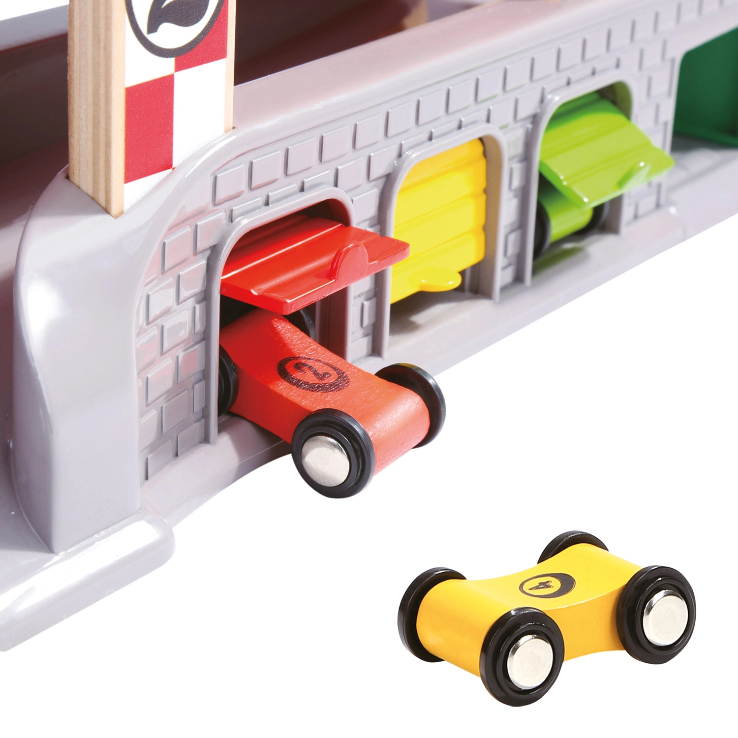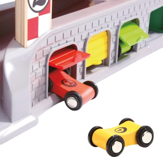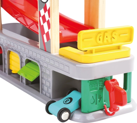 Rozjeďte závody naplno s autodráhou, která nabízí dvojici startovacích plošin, boxy na tankování a tři garáže s otevíratelnými dvířky. Robustní kombinace dřeva, plastu a kovu zaručuje odolnost, zatímco živé barvy přitahují pozornost a podporují dětskou fantazii. Součástí jsou 4 různobarevná autíčka pro nekonečnou porci závodní zábavy.