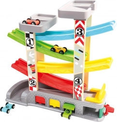 U paty dráhy se nachází tři garáže s otevíratelnými dvířky, které slouží nejen jako parkování, ale i jako praktický úložný prostor a možnost snadného přenášení hračky. Robustní kombinace dřeva, plastu a kovu zajišťuje dlouhou životnost a bezpečnou hru, zatímco pestré barvy přitahují pozornost a podněcují zvídavost.