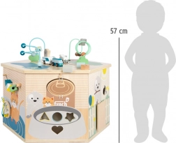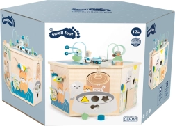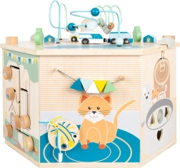 Motorická interaktivní kostka SMALL FOOT Pets XXL je promyšlené vzdělávací centrum pro nejmenší. Osm herních panelů rozvíjí jemnou motoriku, hmat i sluchové vnímání a díky detailním ilustracím přibližuje dětem každodenní život zvířat. Děti zde objeví korálkový labyrint, vkládačku, otočné destičky, provlékačku / třídění barev, skládanku a další interaktivní prvky, které podporují soustředění a logické myšlení.