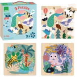Objevte nádherný svět přírody prostřednictvím této sady dřevěných puzzlí. Každý ze tří obrázků zobrazuje jinou tematiku: hráče mezi oblaky, podmořský svět i dobrodružství v džungli. Scéna na obloze potěší krásným pávem, orlem a dalšími ptáky. Mořské motivy oživují velká velryba, chobotnice a přátelské rybičky. Pozemská scéna zahrnuje tygra, krokodýla a papouška ve veselém prostředí džungle.