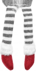 Textilní dekorativní skřítek v šedo‑červeném provedení má typickou vysokou špičatou čepici, dlouhé pruhované nohy a hebký bílý vous. Díky speciálnímu profilu na zadní straně sedí stabilně na hraně stolku či poličky a dodá interiéru hřejivý, útulný nádech.