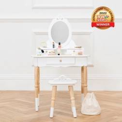 Designový toaletní stolek se stoličkou v nadčasové kombinaci bílé a přírodního dřeva okouzlí detaily i funkčností. Díky pevným materiálům a preciznímu zpracování je ideální do dětského pokoje či herny a podporuje kreativní a rolovou hru, sebevyjádření i jemnou motoriku.