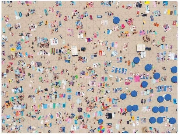 Stylové oboustranné puzzle inspirované ikonickými leteckými fotografiemi Gray Malin přináší atraktivní výzvu a zároveň dekorativní výsledek. Jedna strana zachycuje rušnou pláž z ptačí perspektivy, druhá klidnou hladinu oceánu se skalisky a plavci. Díky rozdílné povrchové úpravě (lesk/mat) snadno poznáte, kterou stranu právě skládáte.
