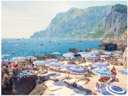 Vychutnejte si ikonický pohled shora: tyrkysové moře, barevné slunečníky a malebné pobřeží, které potěší oko i duši.