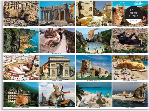 Vtipné puzzle s kočkami na prázdninách o 1500 dílcích nabízí zábavu a relaxaci. Obsahuje šestnáct realistických fotografií, ve kterých si můžete vychutnat kočky kochající se známými místy světa.