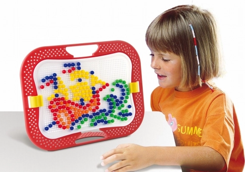S bohatou sadou kolíčků o průměru 10 mm děti snadno skládají jednoduché i složitější obrázky a vzory.