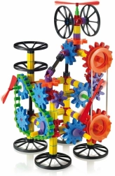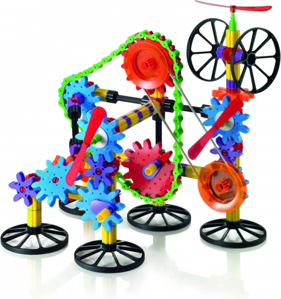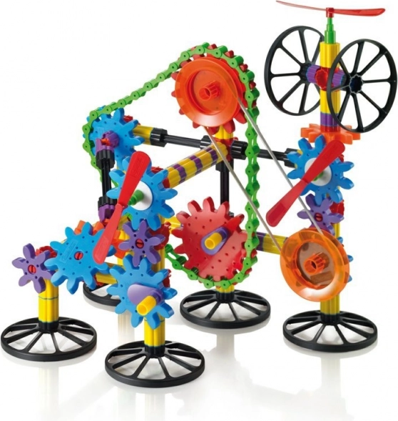 Propojte ozubená kola, řetěz a elastický řemínek a sledujte, jak se přenáší otáčivý pohyb i na vzdálená místa. Skvělý úvod do světa techniky.