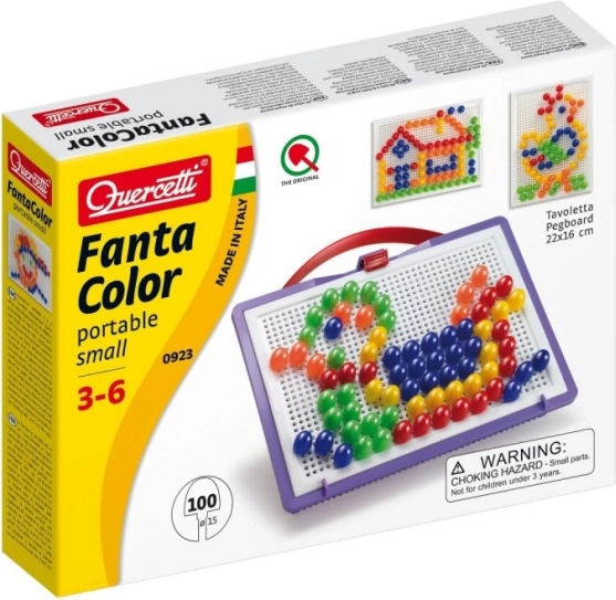 Quercetti Fanta Color přenosná mozaika je inovativní hračka, která přináší nejen zábavu, ale i vzdělávací hodnotu. Pomocí této sady může vaše dítě vytvářet různé obrázky a vzory, čímž rozvíjí svou kreativitu a jemnou motoriku. Kolíčky v různých barvách se snadno zasazují do otvorů na desce, což podporuje koncentraci a trpělivost.