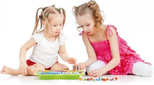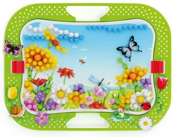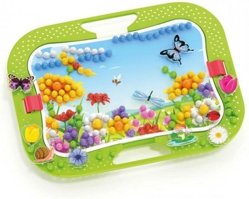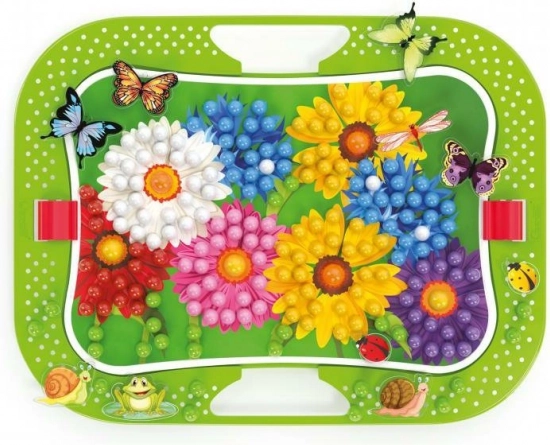 Děti skládají barevné vzory na děrovanou podložku a doplňují je figurkami hmyzu – motýly, vážkami a beruškami. Skvělý způsob, jak rozvíjet fantazii a cit pro barvy.