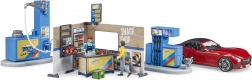 Součástí je variabilní sportovní auto s odnímatelnými koly a střechou, které je plně kompatibilní s figurkami a doplňky BRUDER BWORLD. Oboustranně potištěné kulisy, police s kanystry a ceník podporují kreativní a poučnou hru.