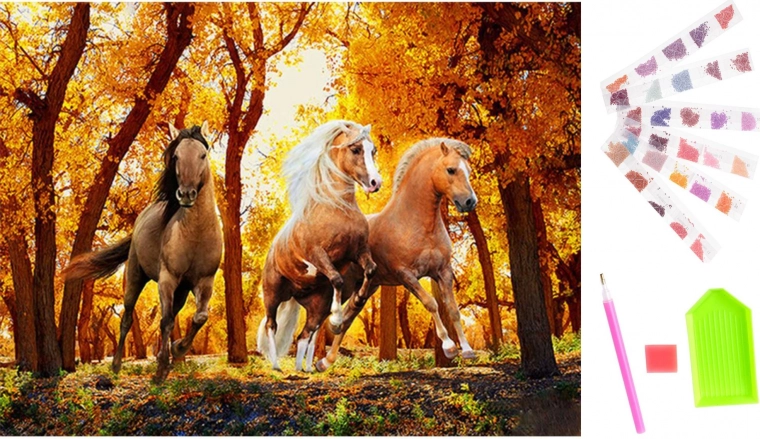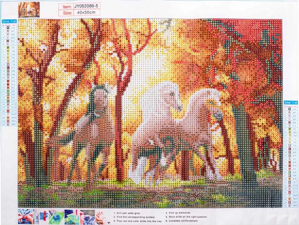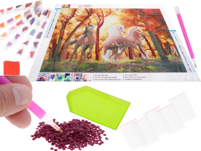 - Balení obsahuje: obrázek, barevné diamanty, aplikátor, suché lepidlo, dávkovač