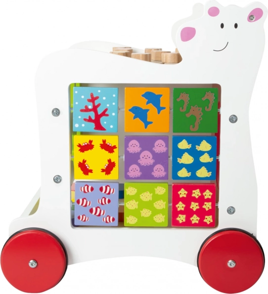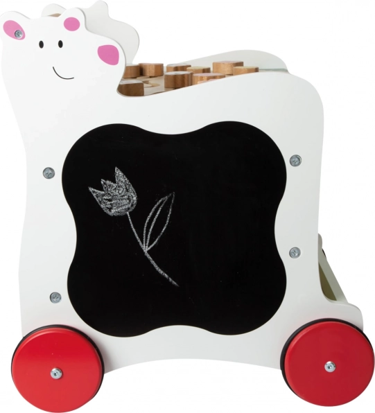 Multifunkční dřevěné chodítko s motivem ledního medvěda nabídne dětem oporu při prvních krůčcích i spoustu zábavy. Rozvíjí hrubou i jemnou motoriku, rozpoznávání tvarů a barev a podporuje kreativitu při kreslení křídou. Stabilní konstrukce, pogumovaná kolečka pro tichý chod a praktický úložný prostor dělají z chodítka skvělého parťáka do každého dětského pokojíčku.