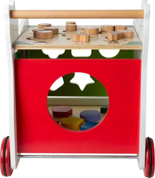 Objevujte svět krůček po krůčku. Toto odolné chodítko z kombinace překližky a masivního dřeva pomáhá dětem bezpečně trénovat rovnováhu a koordinaci, zatímco integrované aktivity – vkládačka se 6 dílky, bludiště a otáčivé kostky – posilují zrakové vnímání i logické myšlení. Tabulka pro kreslení křídou přidává kreativní rozměr učení a hry.