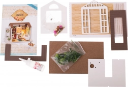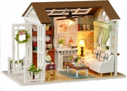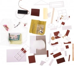 Set obsahuje vše potřebné pro stavbu obývací místnosti a její výbavu včetně lepidla a podrobné obrázkové instrukce. LED osvětlení, které je součástí balení, na baterie (2x AAA 1,5V a 3x 1,5VLR54 - baterie nejsou součástí), nádherně dotváří celkovou atmosféru.