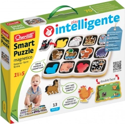 Quercetti Magnetická Vkládačka Farma je úžasná hračka pro malé děti. Na jedné straně tabulky děti mohou vkládat magnetky do připravených otvorů, což jim pomáhá v rozvoji rozpoznávání tvarů a barev. Obrázkové dílky se díky magnetům snadno uchytí a mohou být prakticky uloženy pro další hraní.